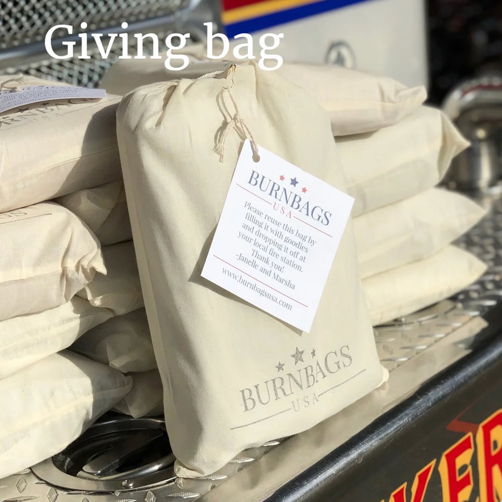 The "giving bag" is a cotton bag that your order will come in. We suggest that you fill the bag with goodies and drop it off at your local fire station. Some suggestions of things to fill it with are fruit, energy drinks or bars, simple meals ideas like pasta and spaghetti sauce or salad and salad dressing, lunch meat and bread, etc. Take a picture and tag us if you fill and drop it off at a station.