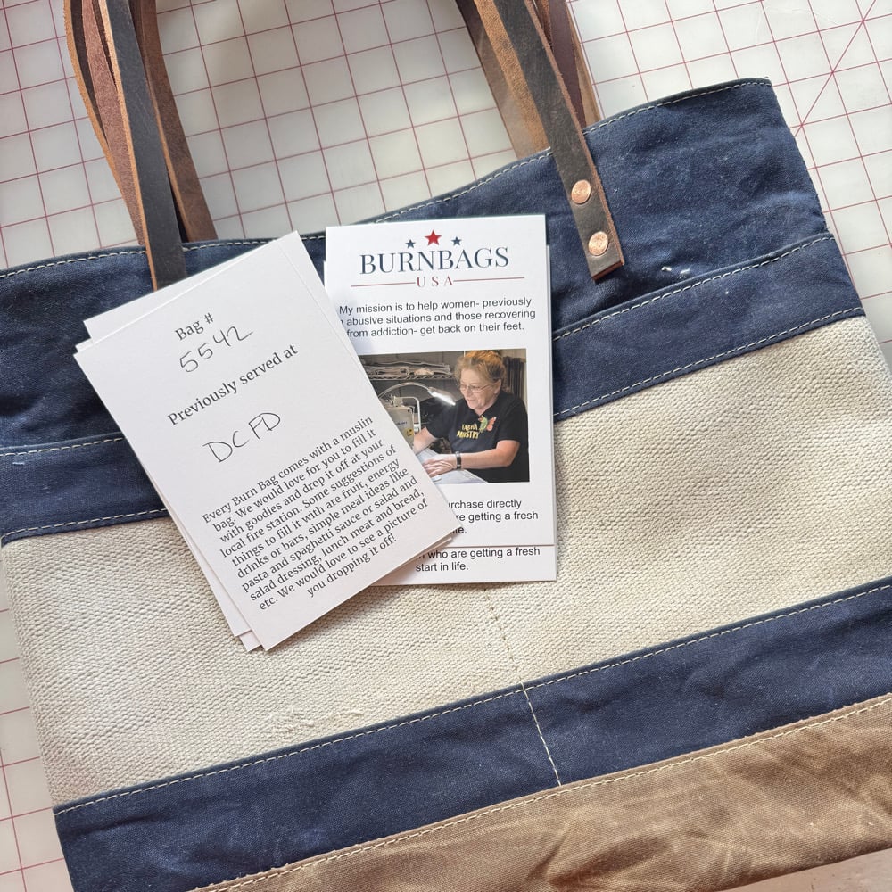 Each Burn Bag is meticulously handcrafted, featuring decommissioned fire hose sourced from North Carolina. Accompanied by an authenticity card, each bag details its production number and the fire station where the hose was used. With every order, you’ll also receive a cotton drawstring bag to fill with treats, which we encourage you to drop off at your local fire station.